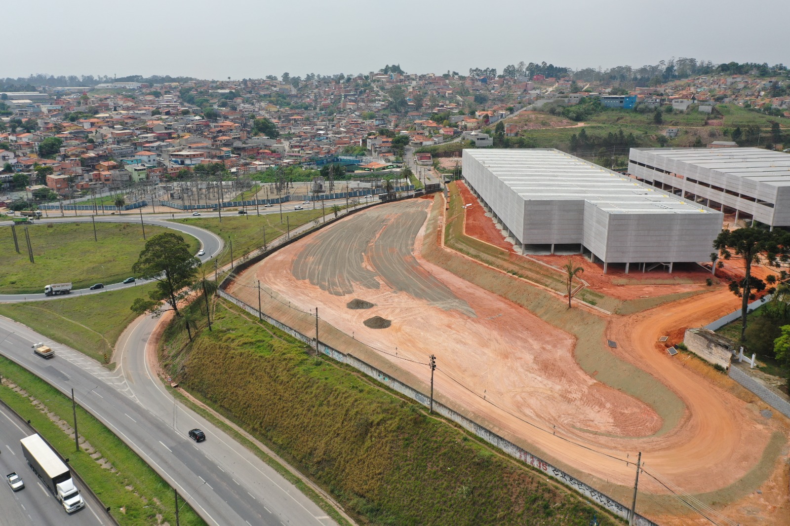 Condomínio em construção de galpões na Rod. Régis Bittencourt, oferecendo galpão de 1.200 m² a 3.000 m³ com previsão de entrega para Fevereiro de 2026.